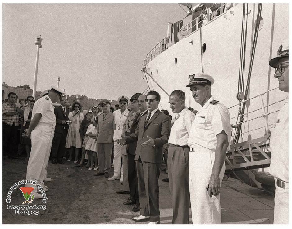 Ο Γεώργιος Χιωτάκης ως Δημαρχος Ροδου, στην τελετή της αναχώρησης του Courier (κινητός σταθμός της Φωνής της Αμερικής) στης 13 Αυγούστου 1964 (Αρχείο Σταύρου Γεωργαλλίδη)