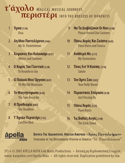 The images included in the cover design of the CD and cassette are photographs of Pigadia, the main port of Karpathos, circa 1920 to 1935. It is where Karpathian emigrants embarked on the long and arduous journey to the foreign lands. It is also the place they longed to set their foot on whilst fulfilling their dream of returning to the motherland. The stage where pain and joy embraced for all to see.